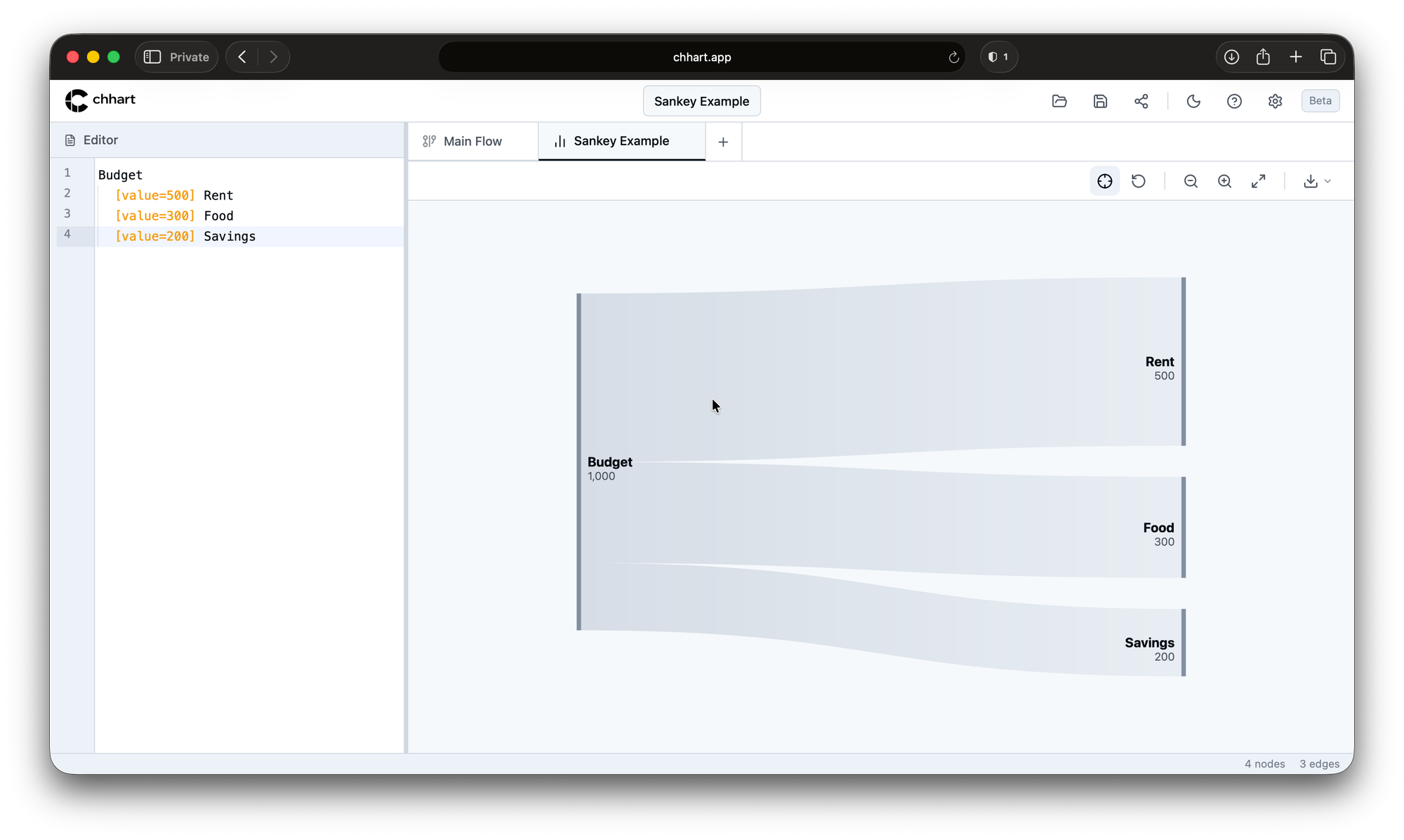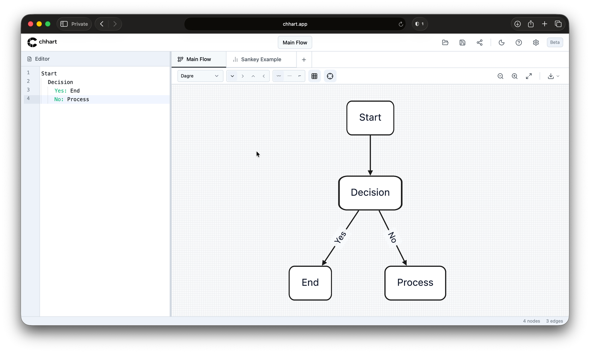 Chhart.app is a free, privacy-first diagramming tool designed for developers, writers, and AI agents. It allows you to convert simple text descriptions into complex Flowcharts and Sankey Diagrams.